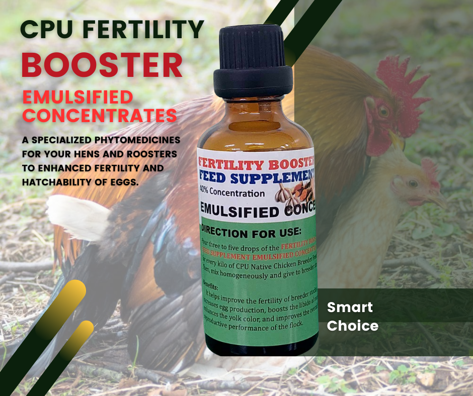 However, CPU Garlic Emulsified Concentrate and CPU Lemongrass Emulsified Concentrate are strongly encouraged to further improve the meat's taste. Our study and experience with our raisers showed that dressed native chickens with such phytomedicines almost had uniform growth and excellent meat quality. Thus, use these products at two to three drops per kilo of CPU Chick Grower Feeds.