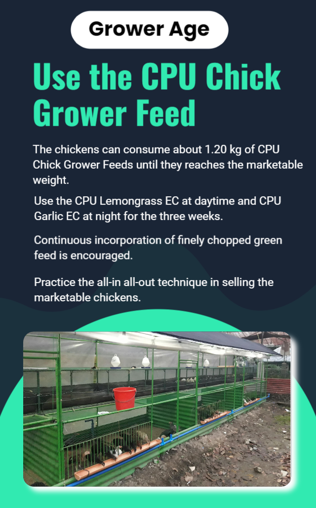 The grower's age usually lasts for 21 days before they are marketed. The ideal liveweight is 850 to 900 grams. On this weight, the free amino acids associated with distinctive taste are higher in concentration. The perfect feed for this age stage is the CPU Chick Grower Feed. It is enriched with natural ingredients that enhance the taste of the meat.